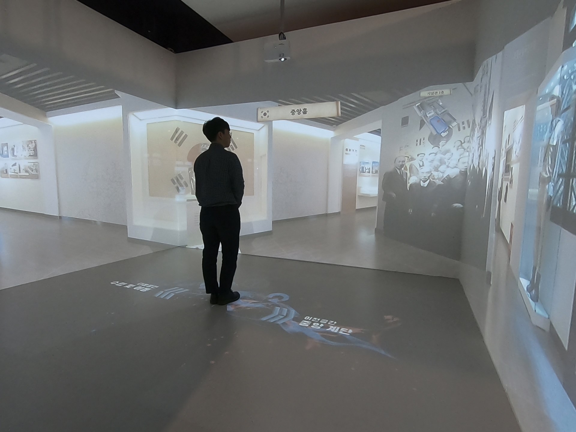 백범김구기념관 2층에 설치된 4면 프로젝션 기반 상설 전시입니다. 실제 충칭 임시정부 청사의 360도 이미지를 활용해 공간을 재현하고, 바닥에 투사된 UI를 제스처 인터페이스로 손을 사용하지 않고 발로 콘텐츠를 조작할 수 있도록 설계했습니다. 방문객은 임시정부 건물 내부를 둘러보며 역사적 공간을 체험하고, 체험을 마친 뒤에는 기념 촬영 기능을 통해 기억에 남는 사진을 남길 수 있습니다.