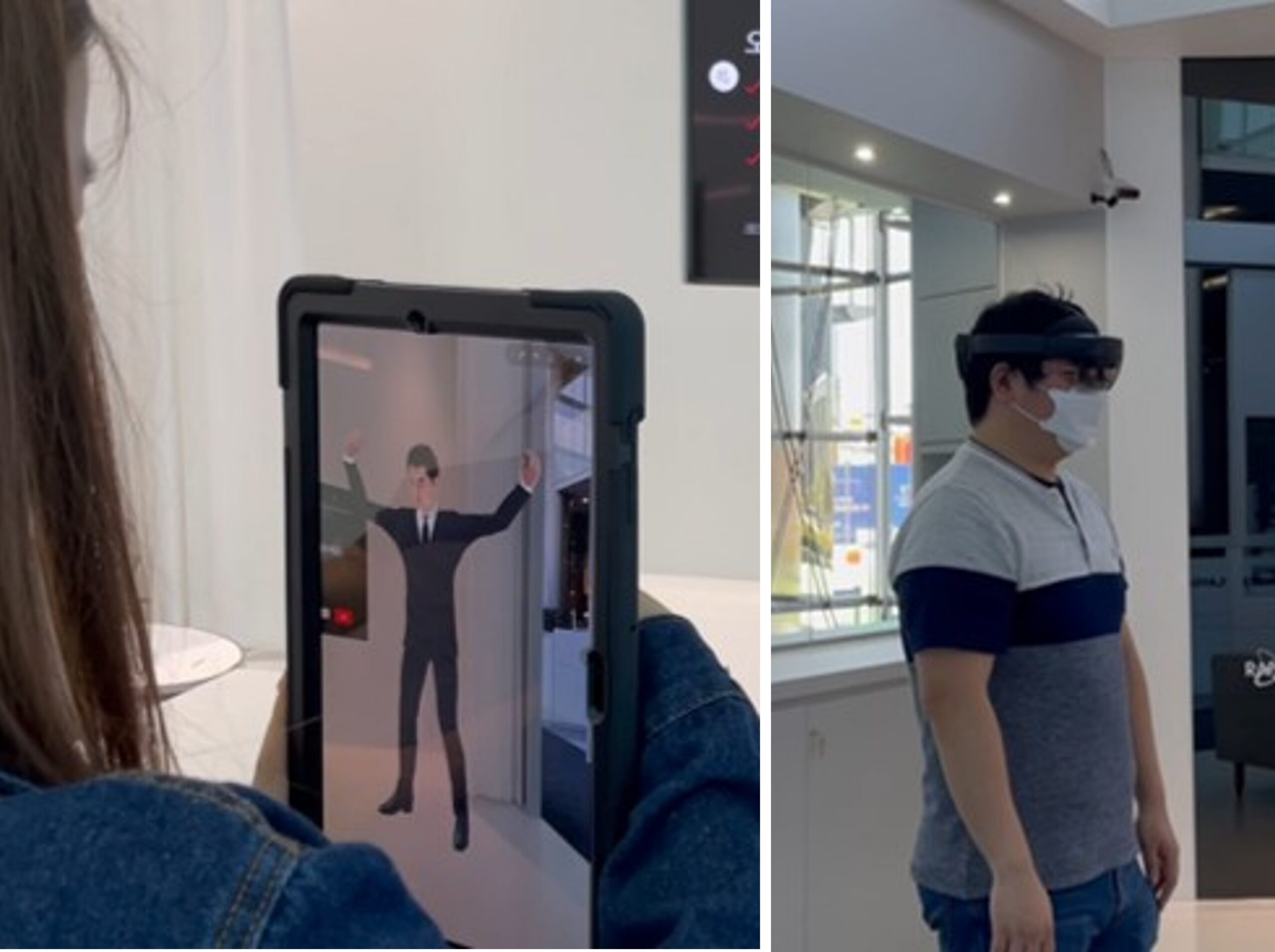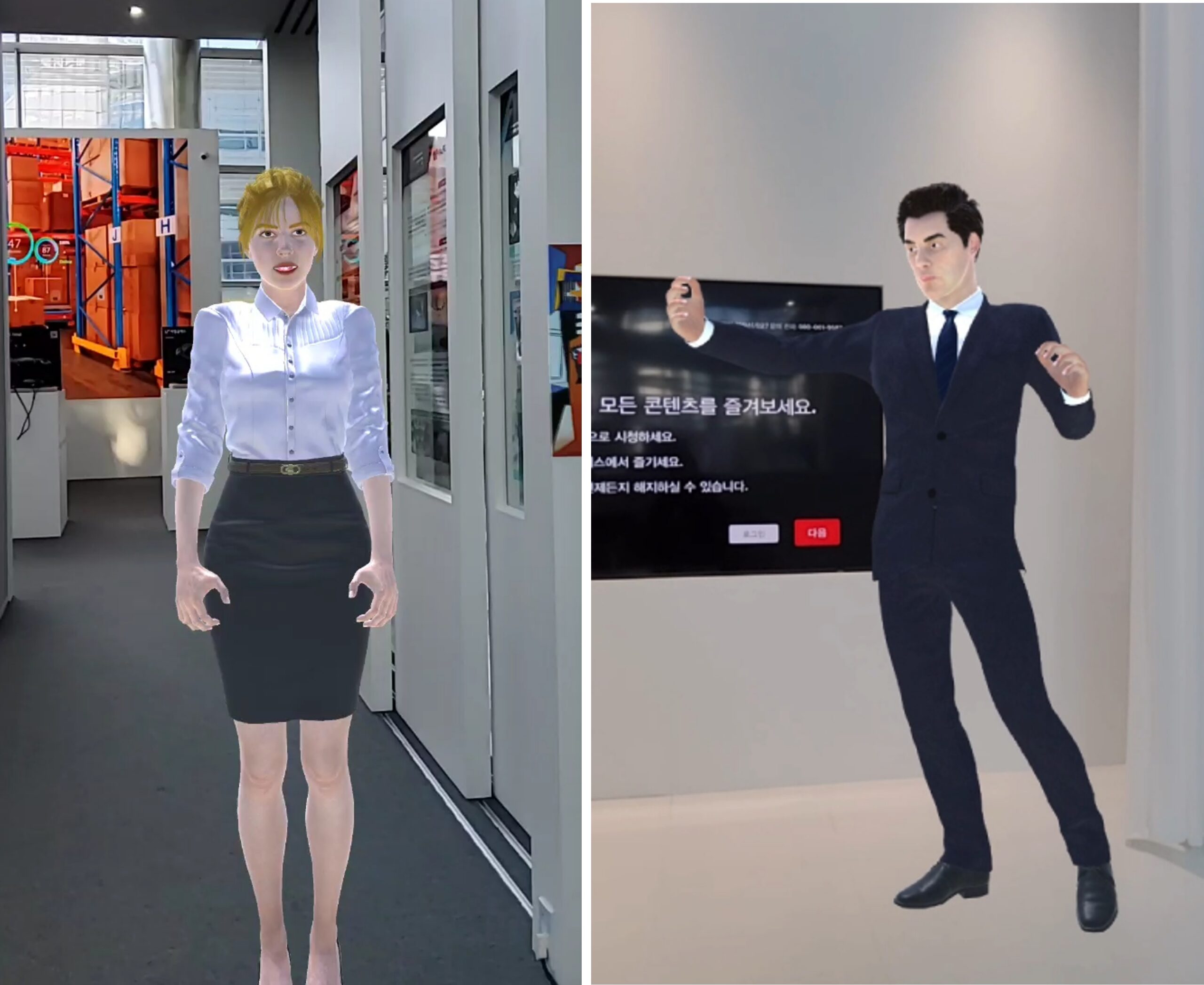 모션캡처 스튜디오에 있는 배우가 실시간으로 AR 캐릭터가 되어 관람객을 안내하는 서비스입니다. 관람객은 AR 태블릿이나 MR HMD를 통해 가상의 도슨트가 전시 공간을 함께 돌아다니며 설명하는 모습을 보게 되고, 음성으로 질문을 주고받으며 상호작용할 수 있습니다. 전시·체험관, 박물관 등에서 인력 부담을 줄이면서도 생동감 있는 안내 서비스를 제공하는 데 적합합니다.